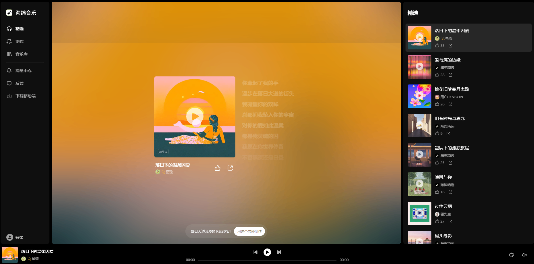 • 灵感创作:用户输入最少 5 个字的灵感关键词,海绵音乐将基于这些关键词生成歌词,帮助用户快速启动音乐创作过程。例如,输入“夏日的海滩”,海绵音乐可能会生成关于阳光、海浪、沙滩等元素的歌词。