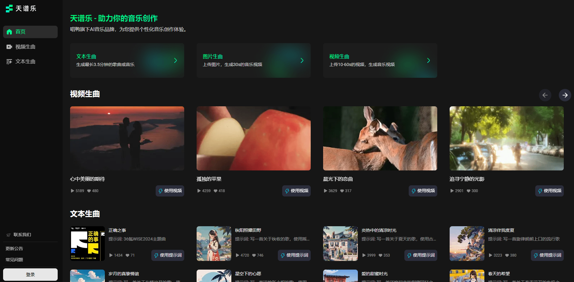 • 音乐创作辅助:帮助专业音乐人提升音乐创作效率,通过“文本生曲”、“图片生曲”和“视频生曲”等功能,快速生成音乐作品,激发创意。