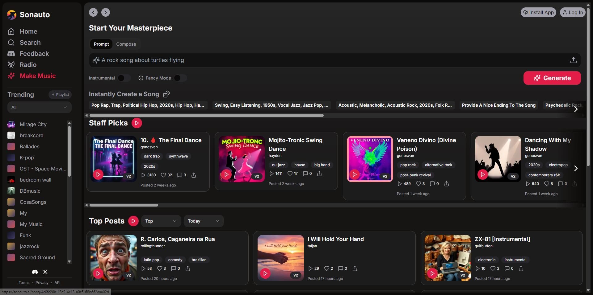 • 快速生成音乐:用户只需提供歌词或描述,选择音乐风格后,Sonauto AI 能够在几秒钟内生成一首完整的音乐作品,生成的音乐作品具有专业水准的音质和音效。