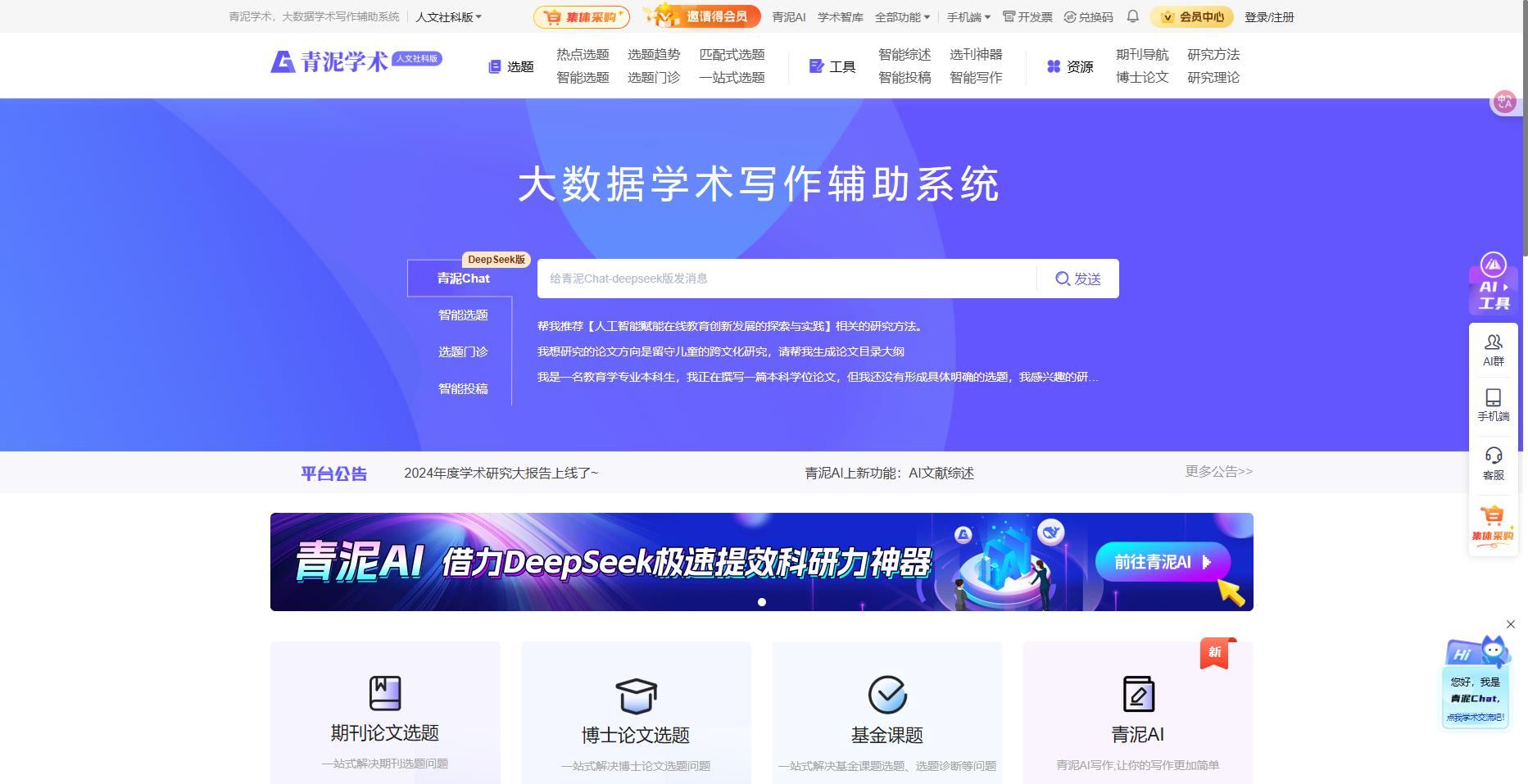 青泥学术是由学术志出品的一款大数据学术写作辅助平台,专注于为学术研究者提供一站式学术写作服务。它通过AI技术和大数据分析,帮助用户解决学术选题、文献分析、论文写作和投稿等多方面的问题,尤其在人文社科领域具有显著优势。