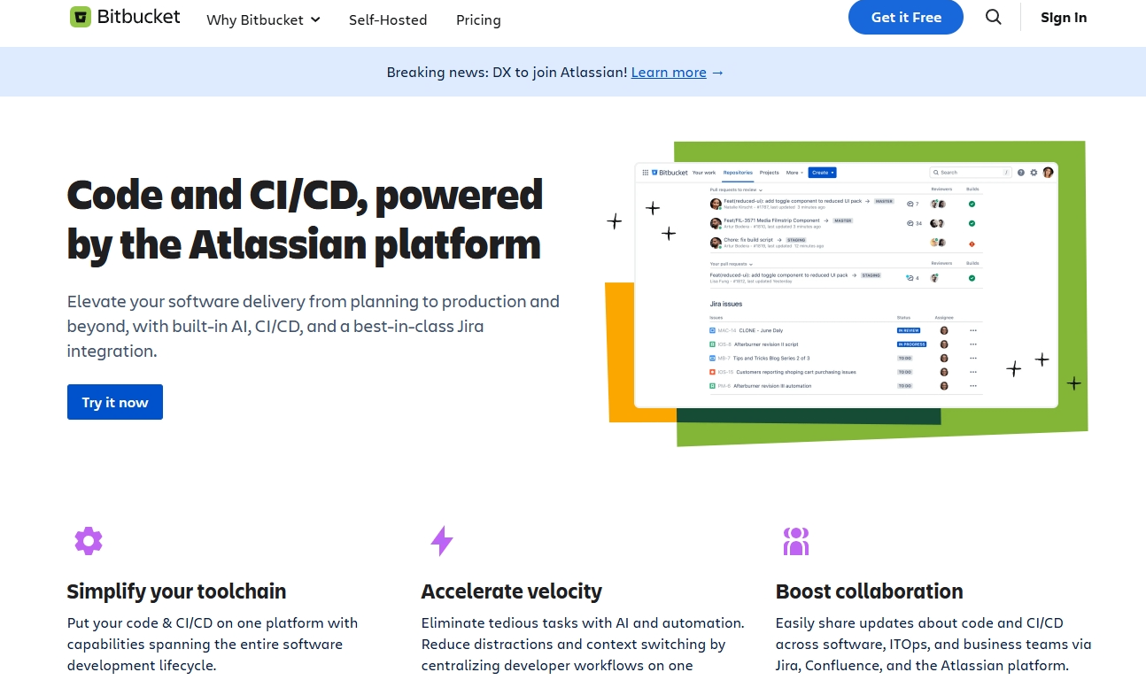 这是 Bitbucket 的核心战场。特别是那些已经在使用 Jira 进行项目管理的团队,Bitbucket 能提供无缝的端到端体验,从任务管理、代码编写、测试到部署。