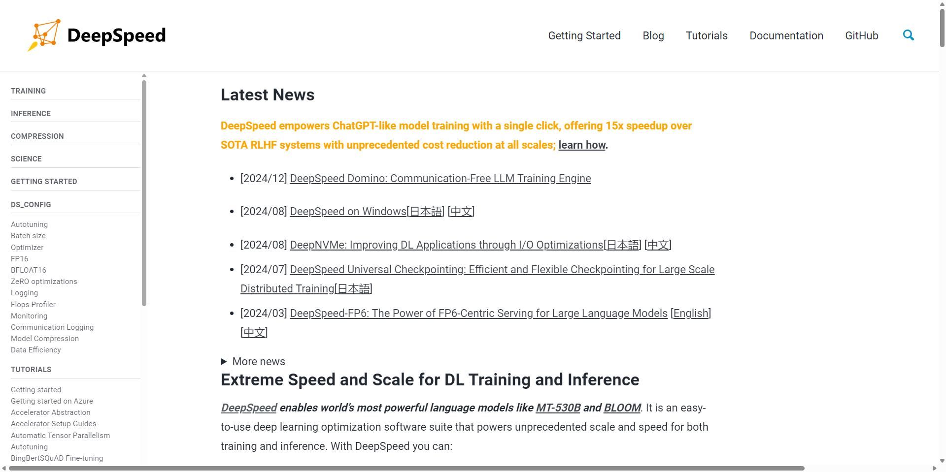 • 与PyTorch无缝集成:DeepSpeed与PyTorch紧密集成,提供了易用的API和丰富的文档支持,用户可以轻松地将DeepSpeed集成到现有的PyTorch项目中。